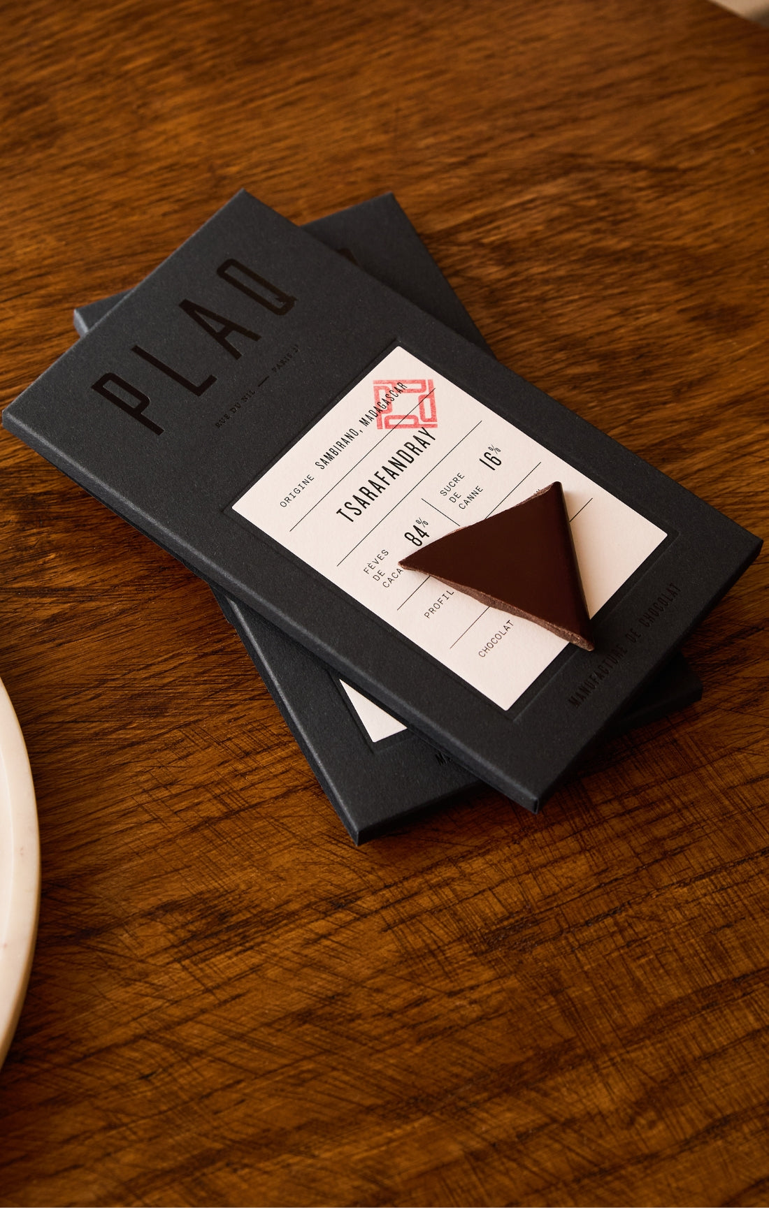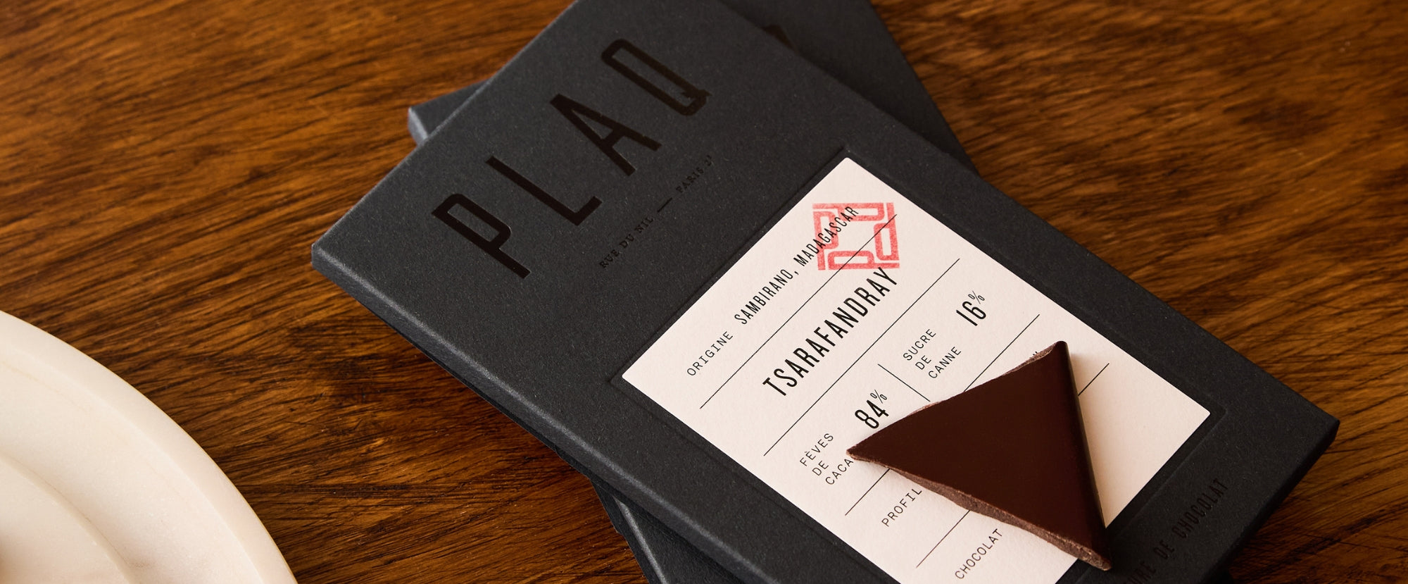 "Plaq est ce qui se fait de mieux en matière de chocolat à Paris actuellement. Des fèves rares, pas de beurre de cacao donc léger, peu de sucre (blond et bio), aucun additif. Un goût pur et unique."