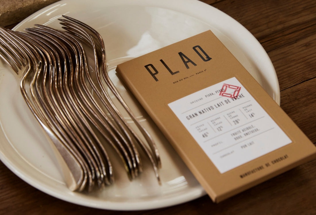 "Plaq est ce qui se fait de mieux en matière de chocolat à Paris actuellement. Des fèves rares, pas de beurre de cacao donc léger, peu de sucre (blond et bio), aucun additif. Un goût pur et unique."