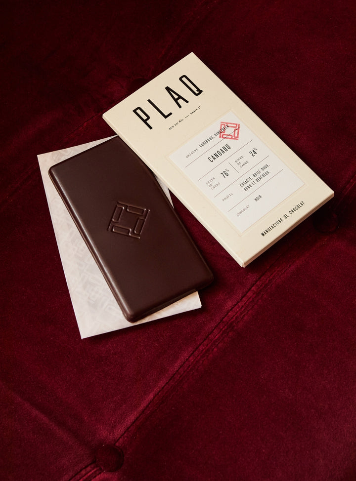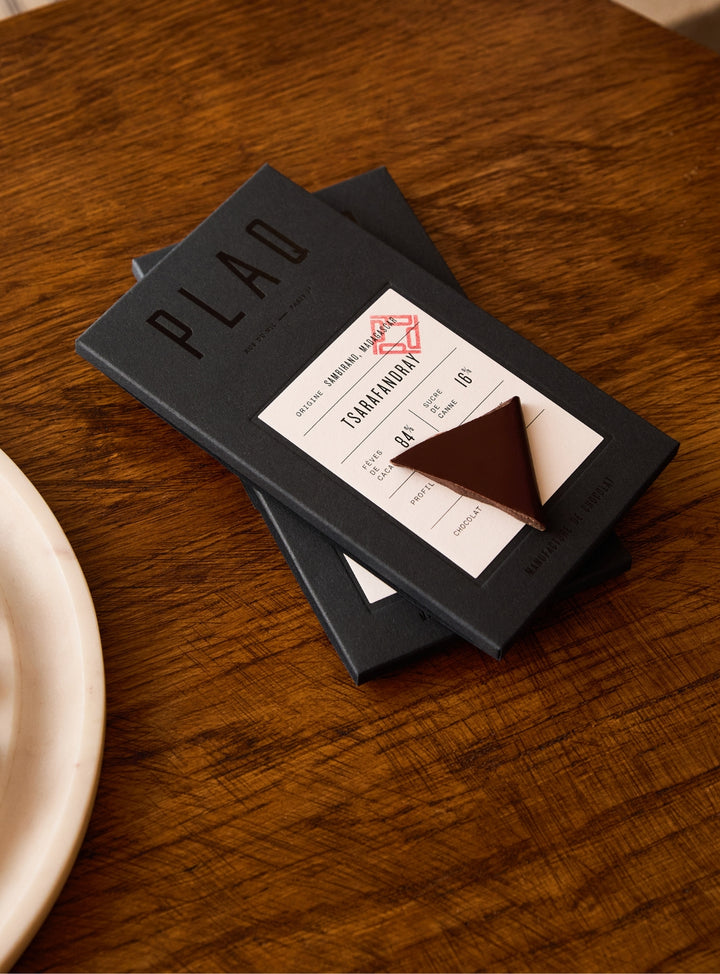 "Plaq est ce qui se fait de mieux en matière de chocolat à Paris actuellement. Des fèves rares, pas de beurre de cacao donc léger, peu de sucre (blond et bio), aucun additif. Un goût pur et unique."