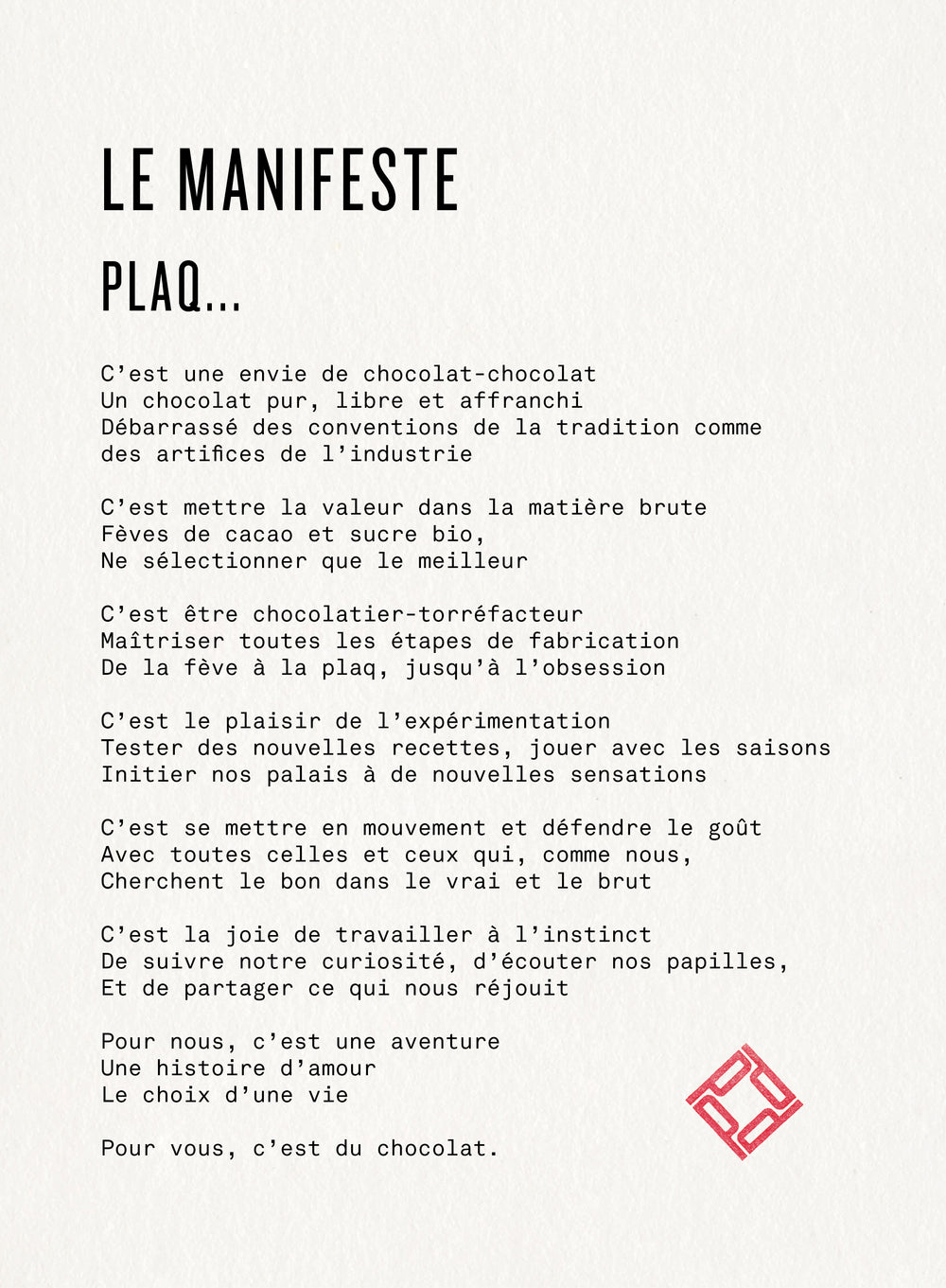 Clac. Croc. PLAQ! This is PLAQ’s anthem. Rhythmic, almost mechanical (but no less poetic). Reminiscent of the rattling of our manufacture boutique. A sound that clatters, a music that purr and flavors that ring in the mouth.