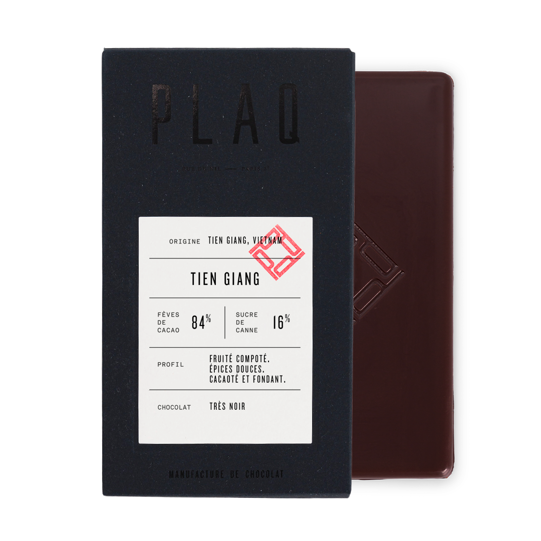 PLAQ Tien Giang 84% is made from a cocoa bean from Vietnam. This chocolate has a fruity-spicy-cocoa profile but in sweetness and subtlety.