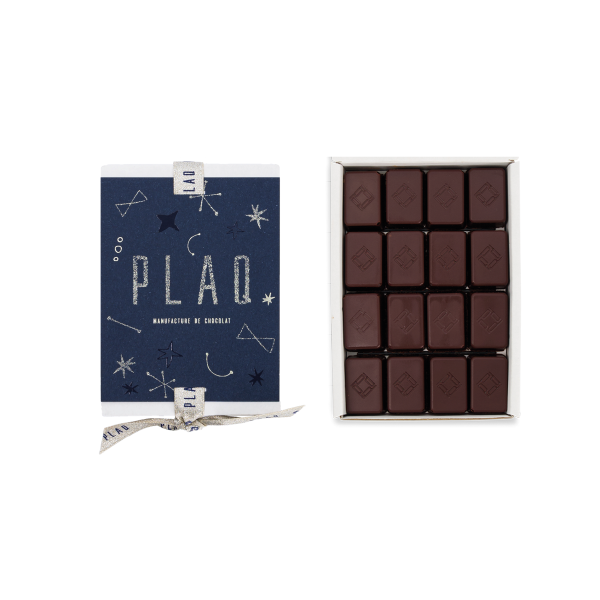 Une boîte de 16 bonbons à la PLAQ : des pralinés intenses, peu sucrés et un chocolat qui a du goût.