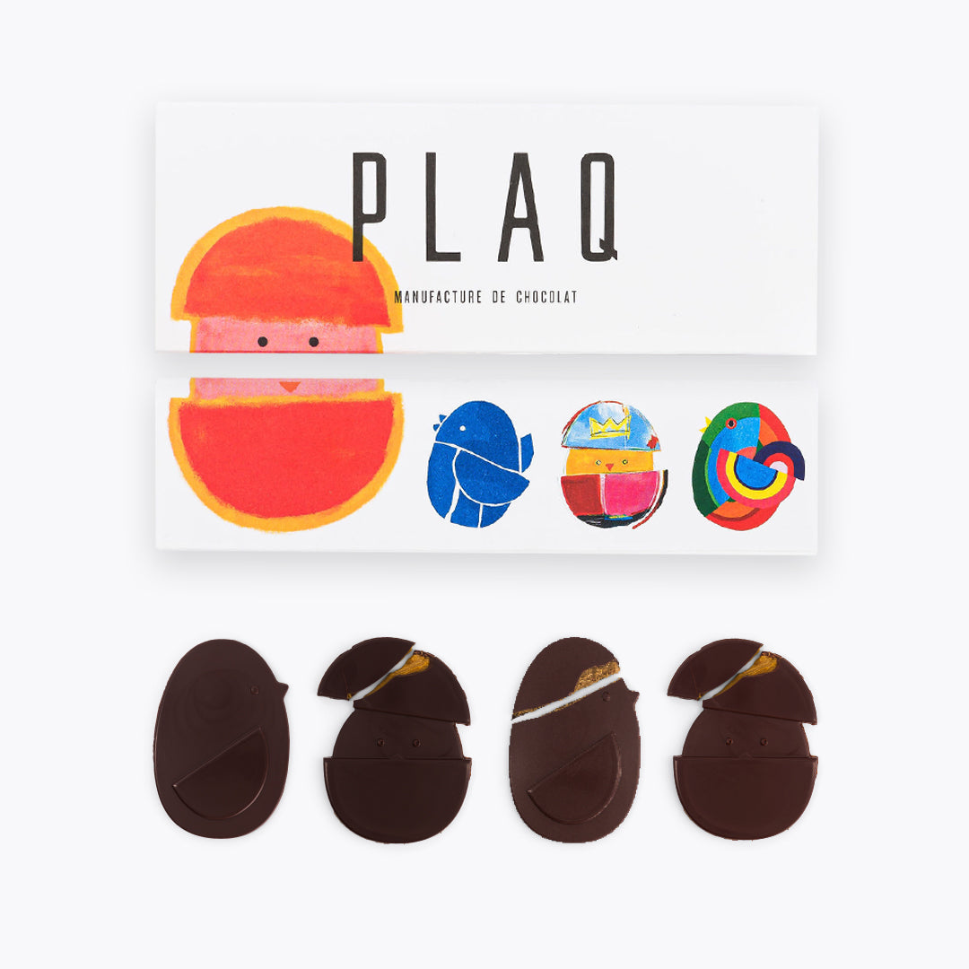 24 Nano Œufs de PLAQ de chocolat Pur noir et Pur lait fourrés avec du praliné noisettes pour une alliance intense.