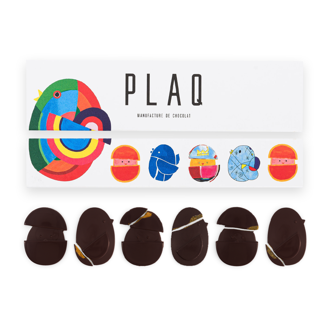 Boîte de 36 nano Œufs de PLAQ de chocolat pur noir praliné noisettes et praliné pistaches, et chocolat pur lait praliné noisettes.