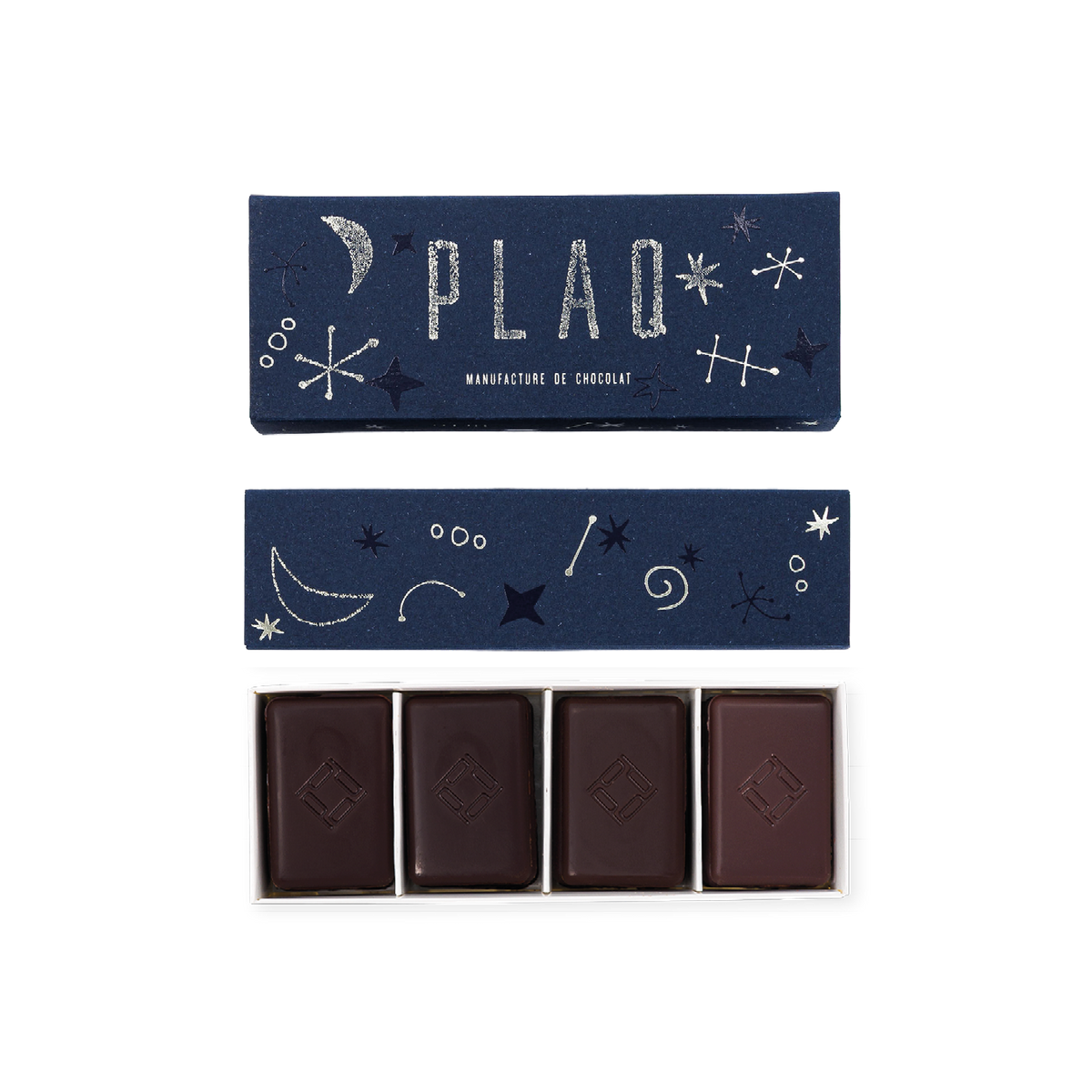 Une boîte découverte de 32 nano PLAQ composée de 3 différents chocolats noir et un chocolat au lait.