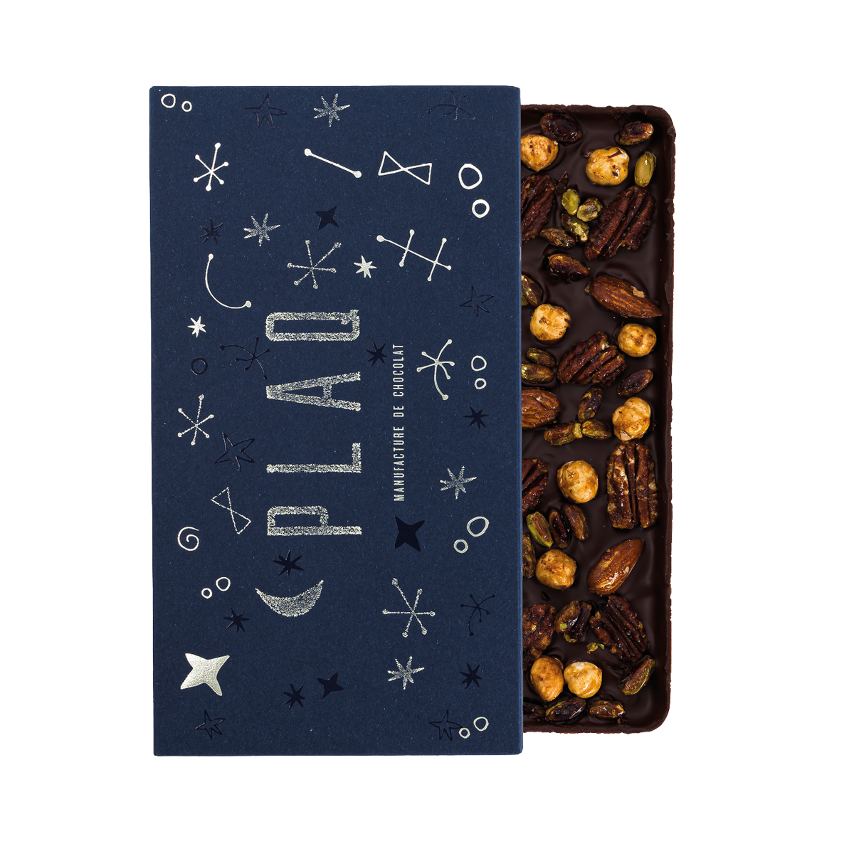 La grande PLAQ à partager ! D'un côté un chocolat pur et fruité, de l'autre nos meilleurs fruits secs caramélisés