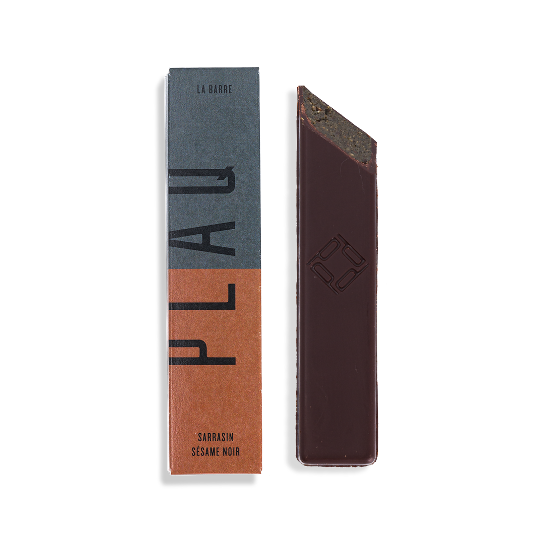 Une barre enrobée de chocolat noir avec à l’intérieur un praliné sarrasin et sésame noir. Texture croustillante et alliance puissante entre les goûts du sarrasin et du sésame noir.