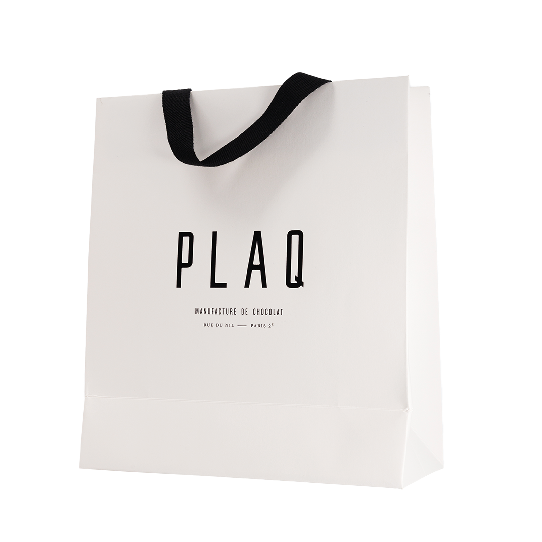 Ce sac est fabriqué en papier kraft blanc, ses anses noires sont en tissu.