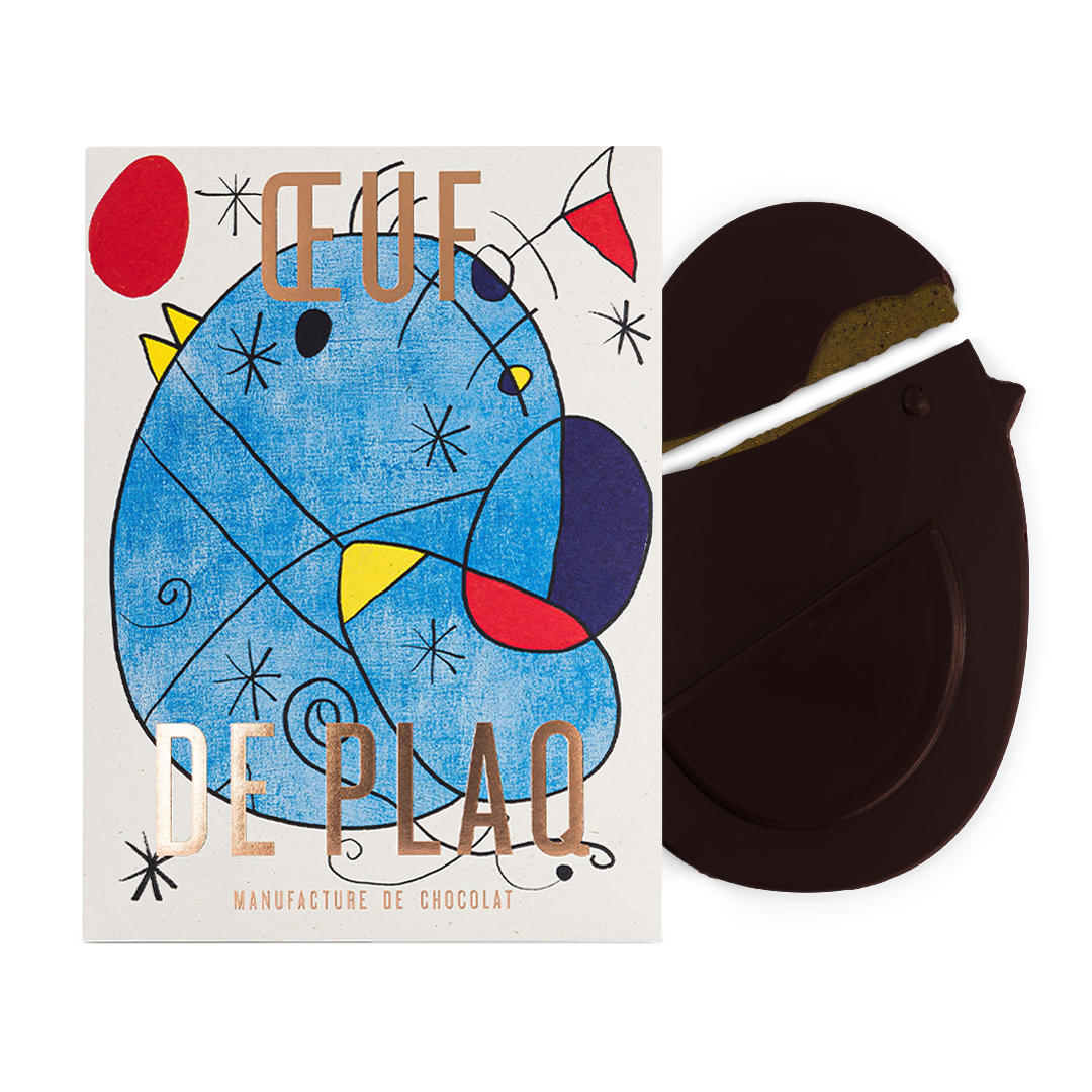 Un Œuf de PLAQ Pur noir avec un insert praliné pistaches de Bronte. Une alliance folle entre notre chocolat noir fruité et notre praliné très riche en pistaches et peu sucré.